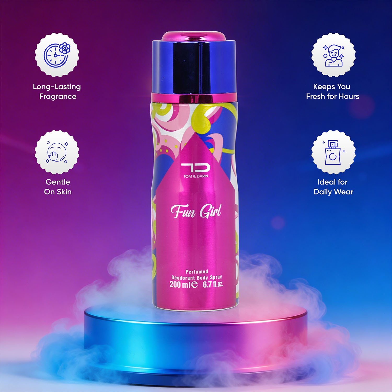 Celebrate your playful and vibrant personality with Tom & Darin Fun Girl Perfumed Deodorant Body Spray. Designed for girls who love colors, confidence, and carefree vibes, this fragrance brings a burst of freshness with a sweet and lively twist.